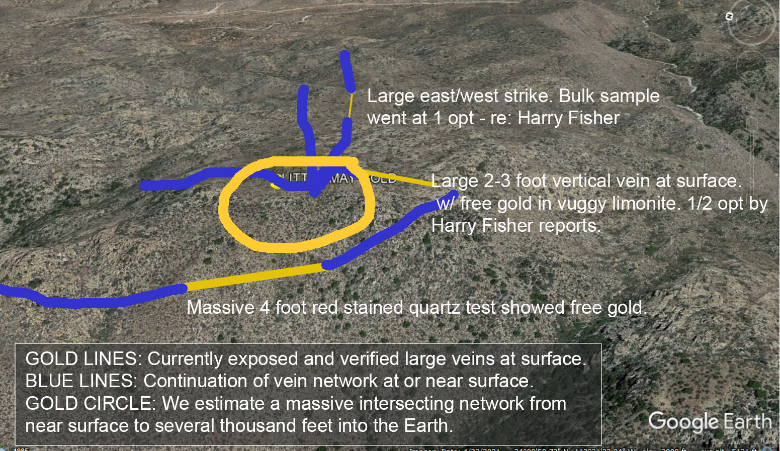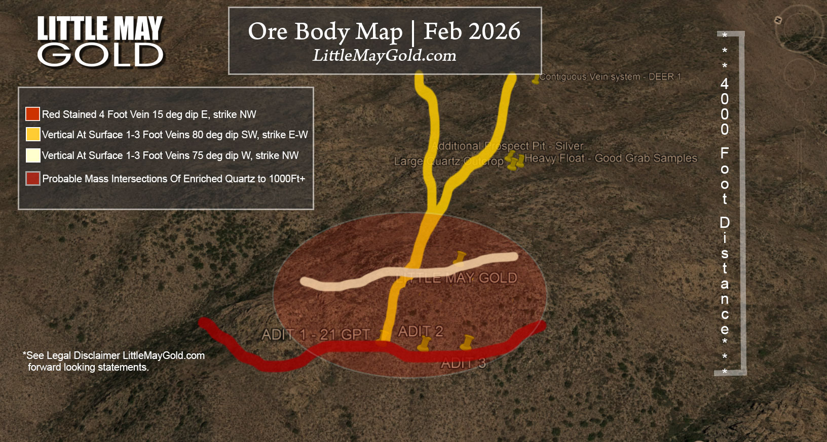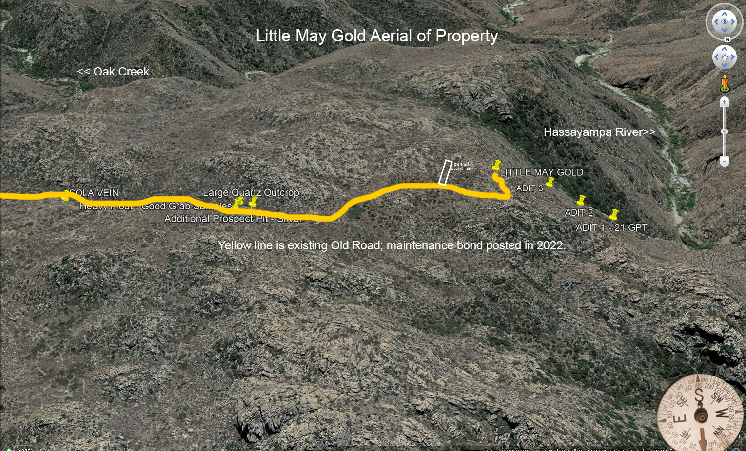 The ore is readily available at surface in large quantities and is easily accessible. This saves millions in development and provides very near-term profitability. Website Available: https://LittleMayGold.com Location: The Little May Group is set in the western foothills of the Bradshaw Mountains in a well-known gold-rich area near the Hassayampa River of Arizona. It is located primarily on Arizona state land. It has been located, staked, and approved for exploratory mining on a mineral lease with the Arizona Land Trust. Feasibility: Bulk exploration will help plan for a larger operation in the future. I have already verified by my own feet, hands, and eyes through exploration and ore testing that there is visible free-milling gold and sulfides readily available starting at the surface in several locations across the property. Historical reports(1946) and my own surveying indicate the reserve is at least 925,000 tons. Modern and historical samples range from .01opt to 2opt(ounces per ton). Historically, 2 non-commercial bulk samples were taken out of the property by former owner Mr. Fisher. The easterly sample ran 1 OPT, and the westerly sample ran 0.5 OPT. I have personally viewed the material from these areas and have witnessed the mineralization and visible free gold by milling and panning small grab samples, as described by B.W. Brown – Field Engineer: “The quartz shows finely divided gold in vugs of limonite and hematite.” The above information regarding geology and values has been verified by myself, Eric Schultz, Claim Owner / State of AZ Mineral Lessee – Schultz Resource Management. Presence of values is also supported by documentation and reports by Mr. Harry Fisher (Former Owner), B.W. Brown (Field Engineer), A. Macfarlane (AZ Field Engineer), and Arthur Clark (Mining Engineer). A copy of the historical reports and writings is available upon request. Geology & Mineralization: Within the canyon, erosion has presented an at-surface ore body, which I have personally observed and visually documented. It consists of massive 2–4 foot red wine-stained and highly mineralized quartz containing free-milling gold, silver, and sulfides (documented by Mr. Fisher and Engineer B.W. Brown, 1944). The geology of mineralization is Bradshaw Granite and monzonite porphyry, with diabase and rhyolite dikes. Veins are quartz showing traces of galena, copper, vanadium, and free gold associated with iron pyrite and brown hematite (Harry Fisher, December 14, 1946). The well-known mines of Octave and Congress are 6 miles and 12 miles west, respectively. These mines were in ore production to depths of more than 2,000 feet below the surface. Due to the declivity and erosion, the vein is projected to a depth of 600–800 feet on the incline or dip at the westerly end into the Hassayampa River Canyon. “About 24 samples assayed at various locations showed values principally in gold ranging from .01 of an ounce to 2 ounces per ton.” – B.W. Brown, Field Engineer 1944 I, Eric Schultz, explored and photographed 3 adits below the rim of the canyon. The width of the vein is 1–4 feet, and the verified visible range from the canyon declivity at 600 feet below the primary surface of the claims to the easterly visible vein indicates an ore body in excess of 925,000 tons.